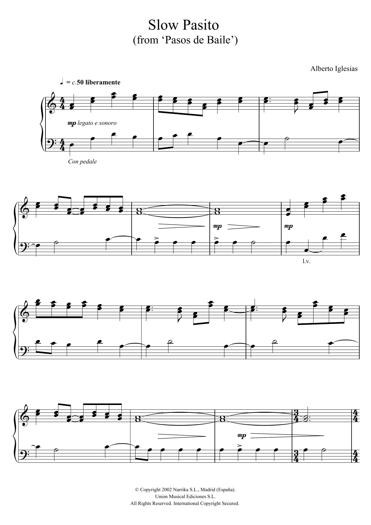 Download or print Alberto Iglesias Slow Pasito (from "Pasos de Baile") sheet music, chords and digital score arranged for Piano Solo. This Film/TV score includes 2 page(s).