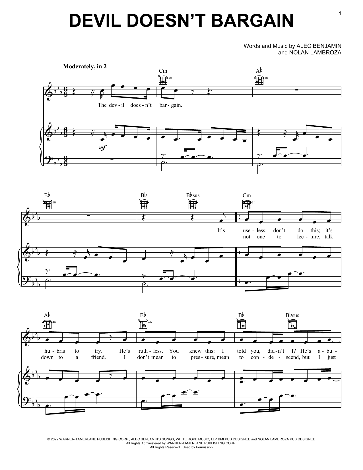 Download or print Alec Benjamin Devil Doesn't Bargain sheet music, chords and digital score arranged for Piano, Vocal & Guitar Chords (Right-Hand Melody). This Pop score includes 5 page(s).