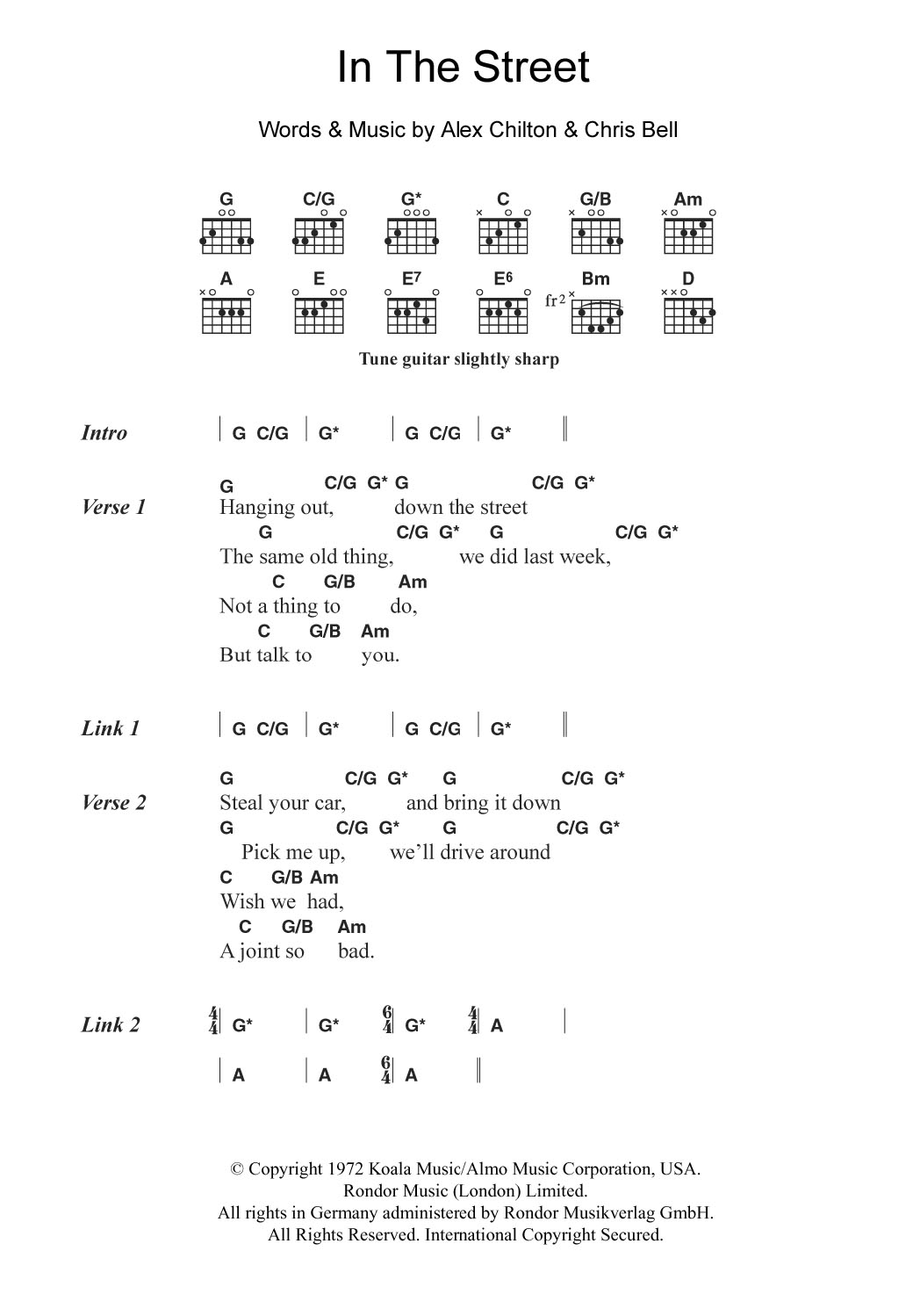 Download or print Alex Chilton In The Street sheet music, chords and digital score arranged for Guitar Chords/Lyrics. This Pop score includes 2 page(s).