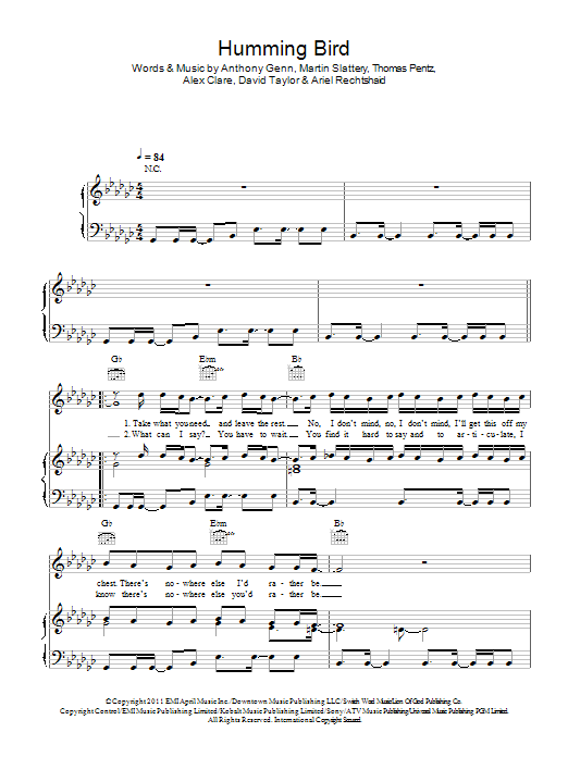Download or print Alex Clare Humming Bird sheet music, chords and digital score arranged for Piano, Vocal & Guitar Chords. This Pop score includes 6 page(s).
