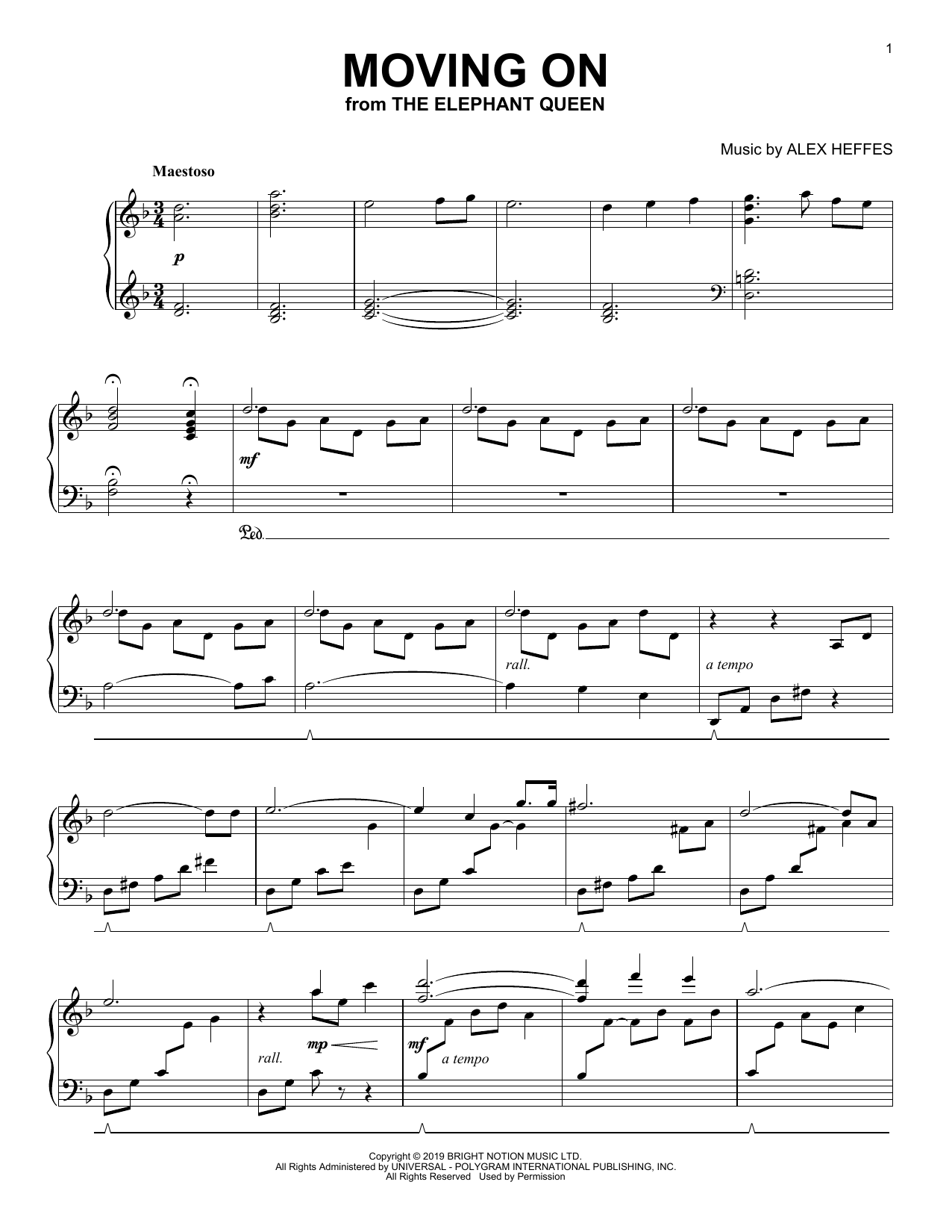 Download or print Alex Heffes Moving On (from The Elephant Queen) sheet music, chords and digital score arranged for Piano Solo. This Film/TV score includes 6 page(s).