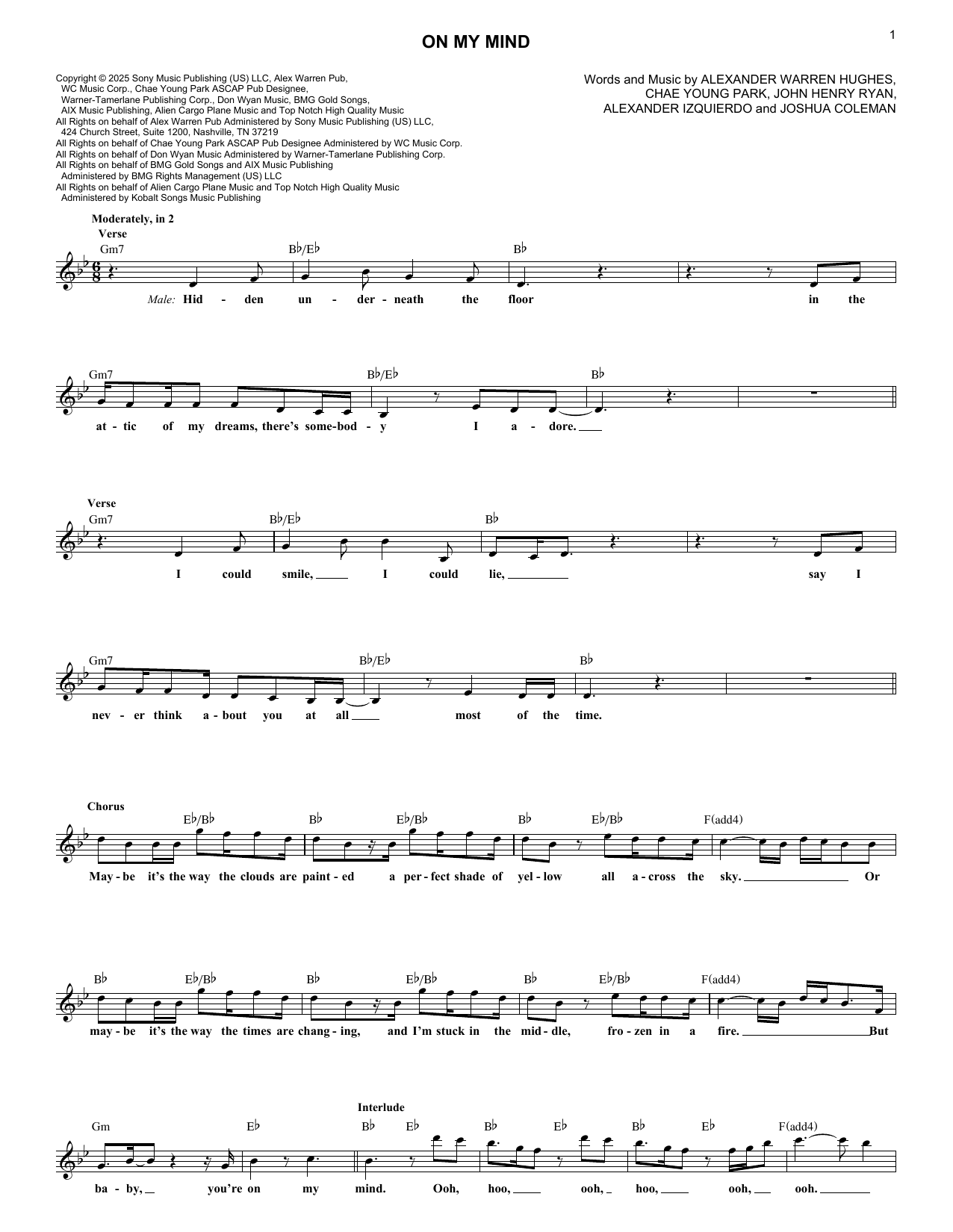 Download or print Alex Warren and ROSÉ On My Mind sheet music, chords and digital score arranged for Lead Sheet / Fake Book. This Pop score includes 3 page(s).