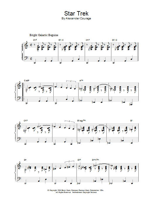 Download or print Alexander Courage Star Trek sheet music, chords and digital score arranged for Piano Solo. This Film/TV score includes 2 page(s).