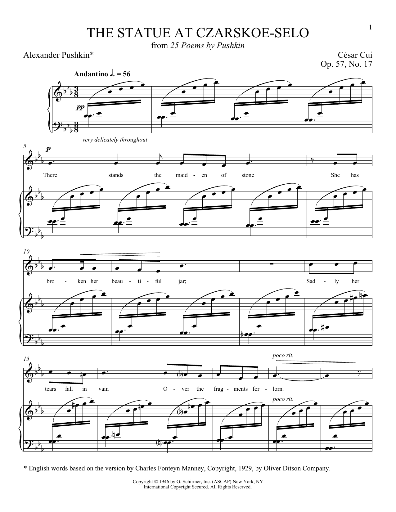 Download or print Alexander Pushkin The Statue At Czarkor-Selo sheet music, chords and digital score arranged for Piano & Vocal. This Classical score includes 2 page(s).
