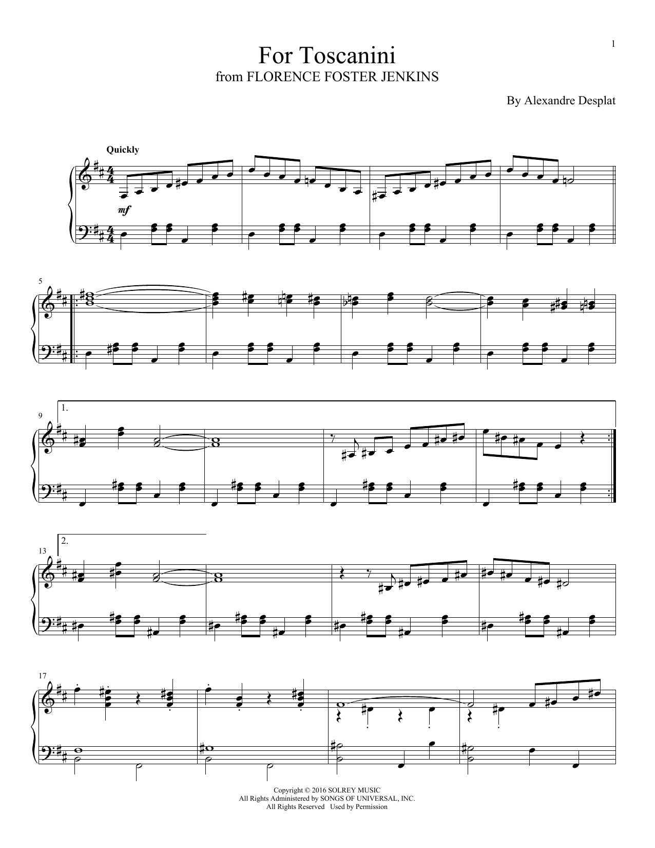 Download or print Alexandre Desplat For Toscanini sheet music, chords and digital score arranged for Piano Solo. This Film/TV score includes 4 page(s).