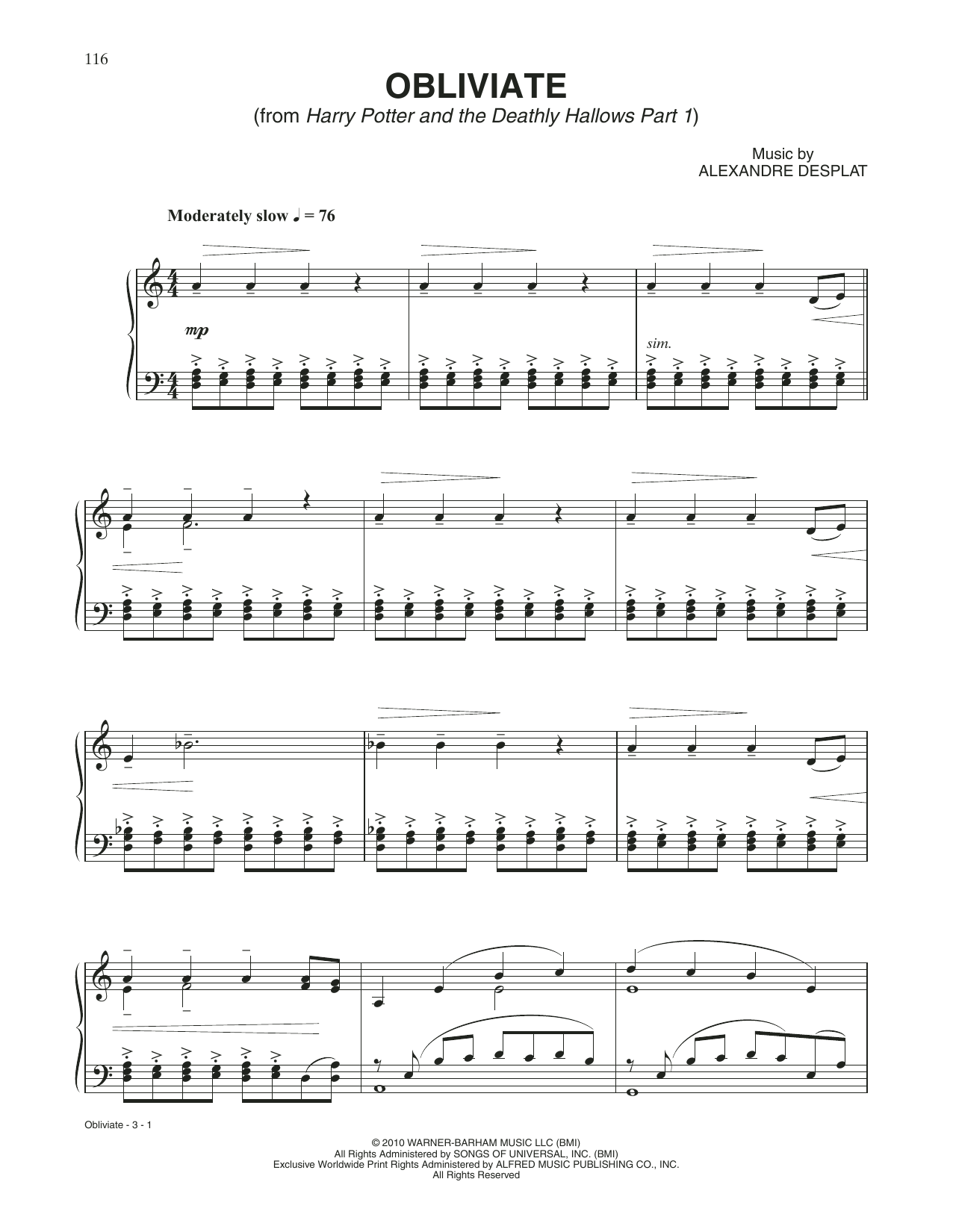 Download or print Alexandre Desplat Obliviate (from Harry Potter And The Deathly Hallows, Pt. 1) sheet music, chords and digital score arranged for Piano Solo. This Film/TV score includes 3 page(s).