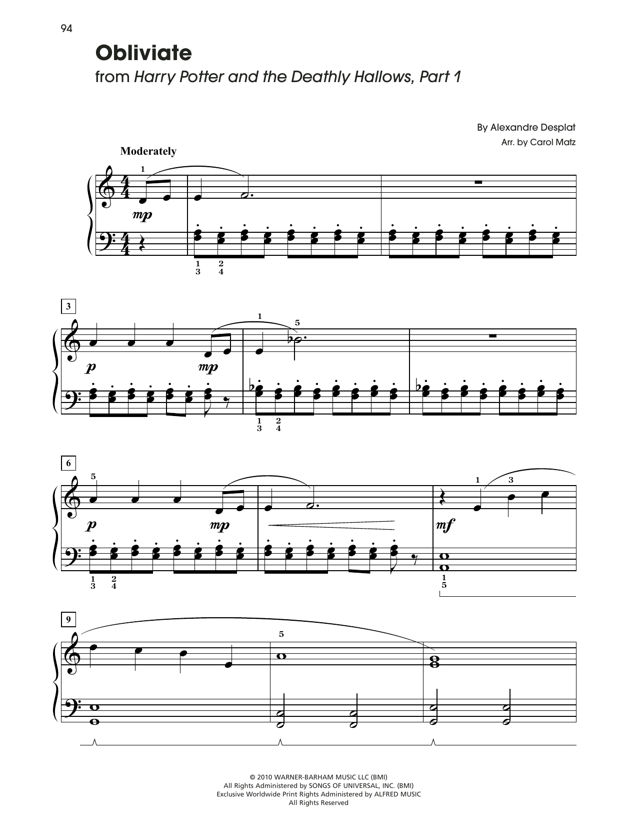 Download or print Alexandre Desplat Obliviate (from Harry Potter) (arr. Carol Matz) sheet music, chords and digital score arranged for Big Note Piano. This Film/TV score includes 3 page(s).