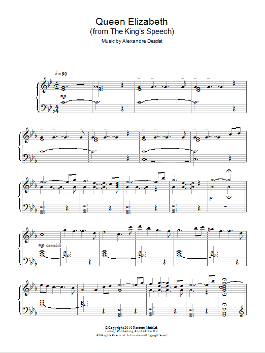 Download or print Alexandre Desplat Queen Elizabeth sheet music, chords and digital score arranged for Piano Solo. This Film/TV score includes 2 page(s).