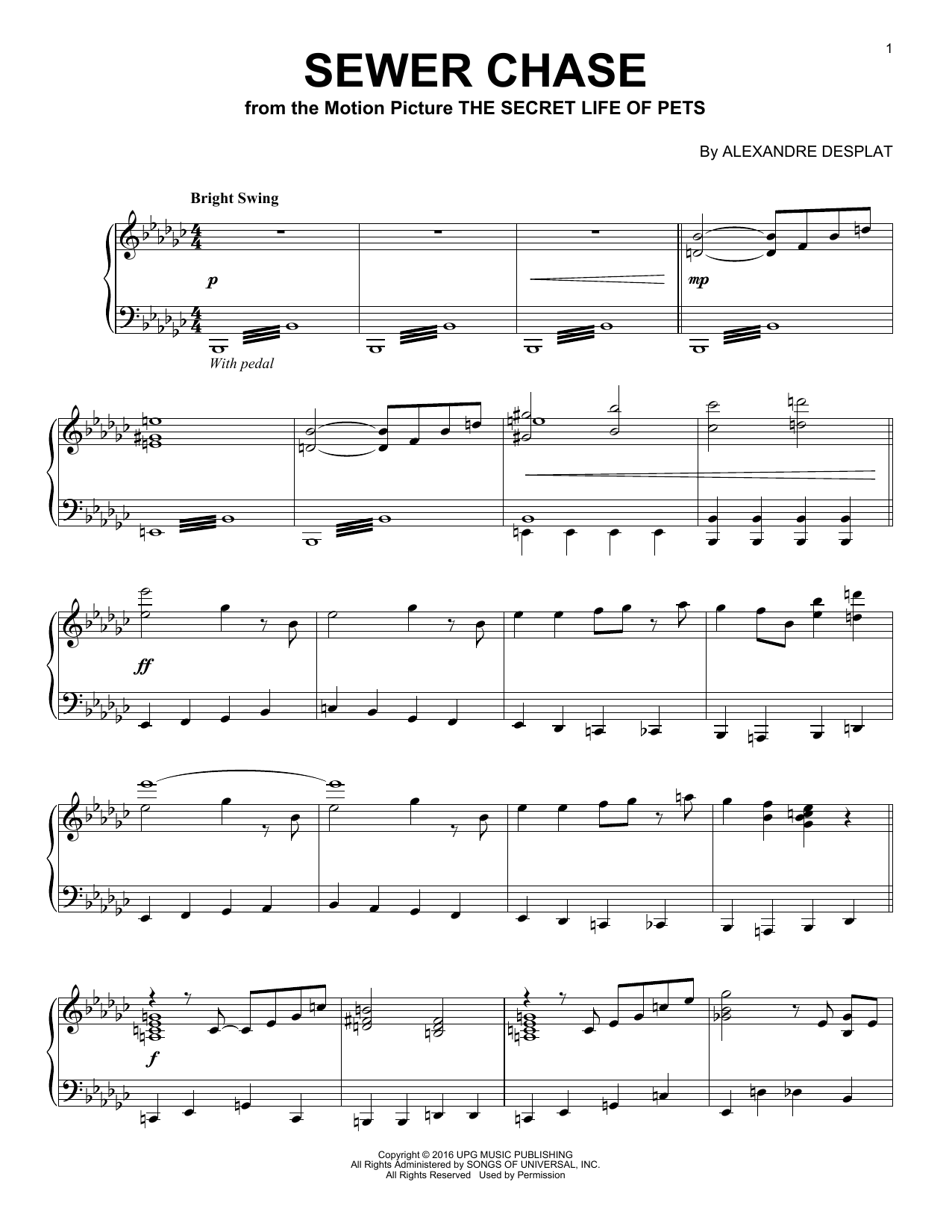 Download or print Alexandre Desplat Sewer Chase sheet music, chords and digital score arranged for Piano Solo. This Children score includes 2 page(s).