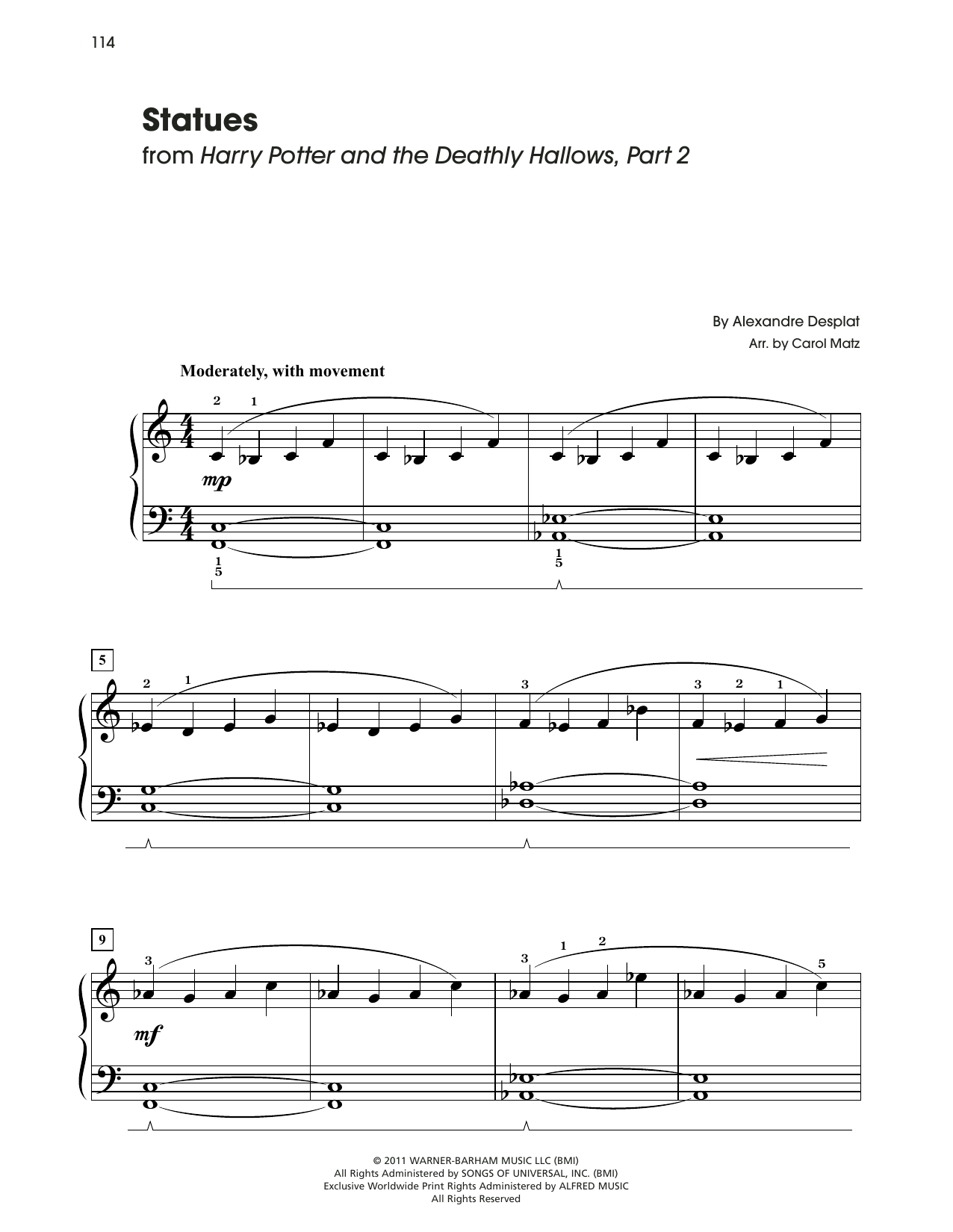 Download or print Alexandre Desplat Statues (from Harry Potter) (arr. Carol Matz) sheet music, chords and digital score arranged for Big Note Piano. This Film/TV score includes 5 page(s).