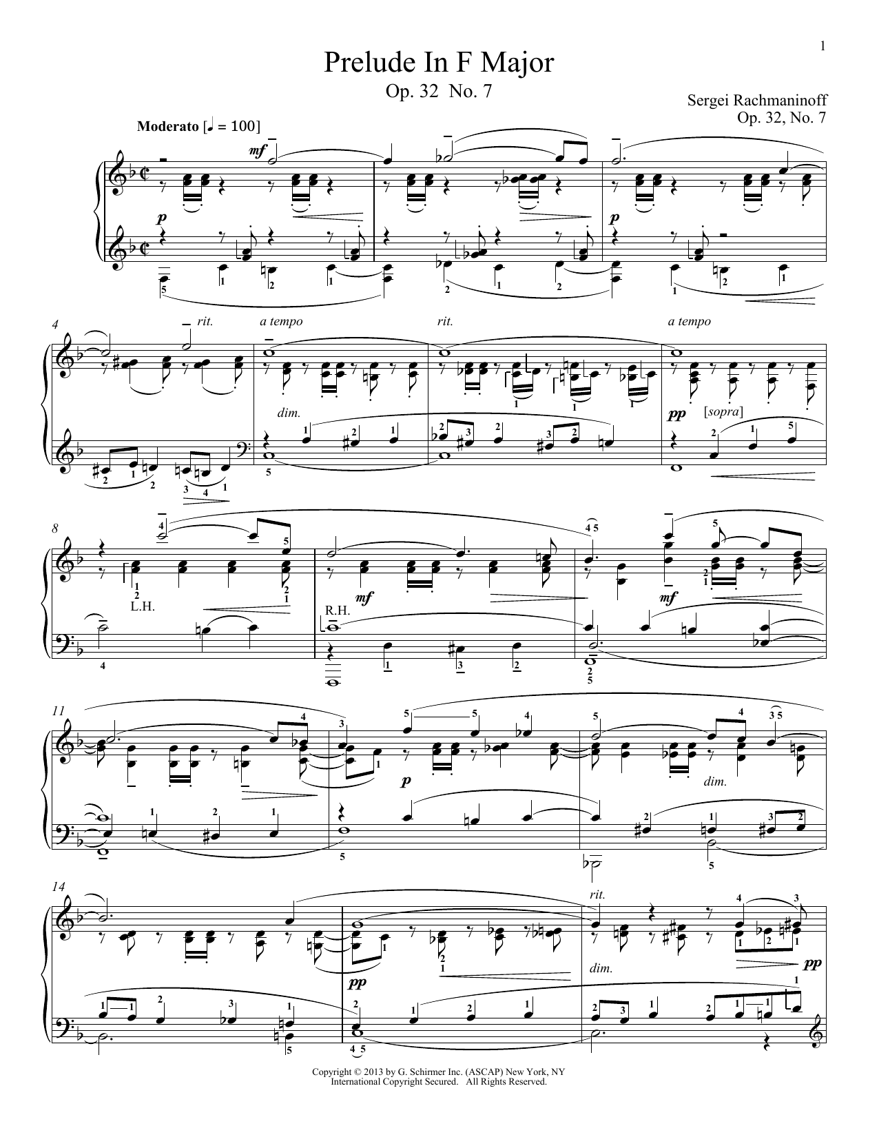 Download or print Sergei Rachmaninoff Prelude In F Major, Op. 32, No. 7 sheet music, chords and digital score arranged for Piano Solo. This Classical score includes 3 page(s).