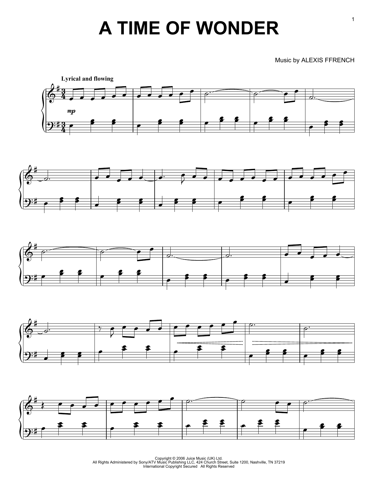 Download or print Alexis Ffrench A Time Of Wonder sheet music, chords and digital score arranged for Piano Solo. This Contemporary score includes 6 page(s).