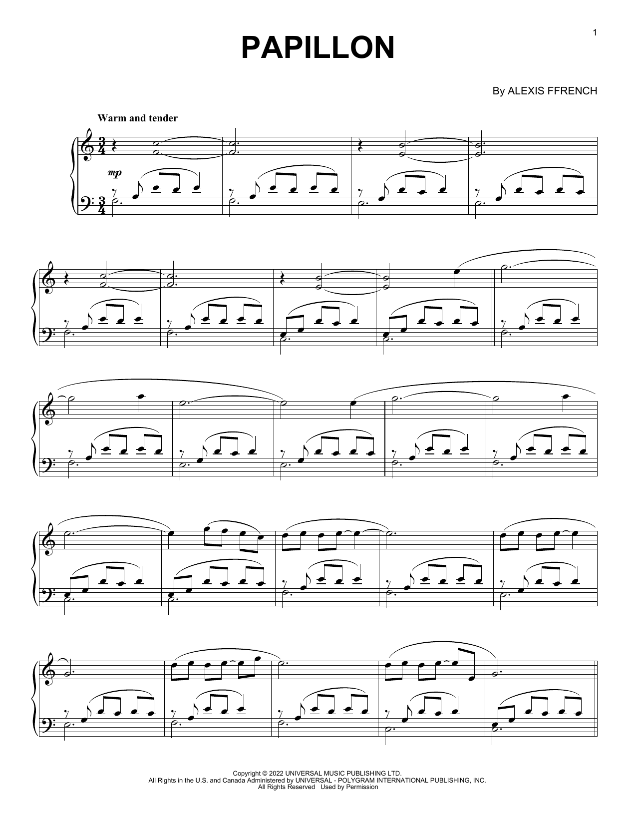 Download or print Alexis Ffrench Papillon sheet music, chords and digital score arranged for Piano Solo. This Contemporary score includes 5 page(s).