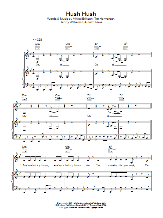 Download or print Alexis Jordan Hush Hush sheet music, chords and digital score arranged for Piano, Vocal & Guitar Chords. This Pop score includes 8 page(s).