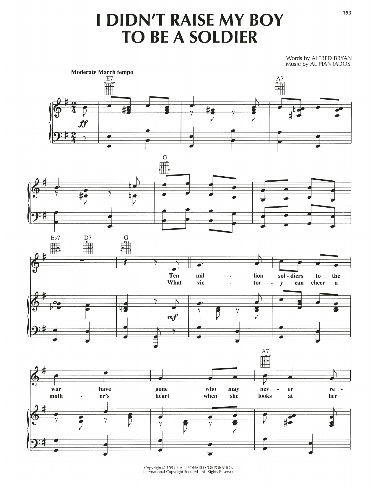 Download or print Alfred Bryan I Didn't Raise My Boy To Be A Soldier sheet music, chords and digital score arranged for Piano, Vocal & Guitar Chords (Right-Hand Melody). This Patriotic score includes 5 page(s).