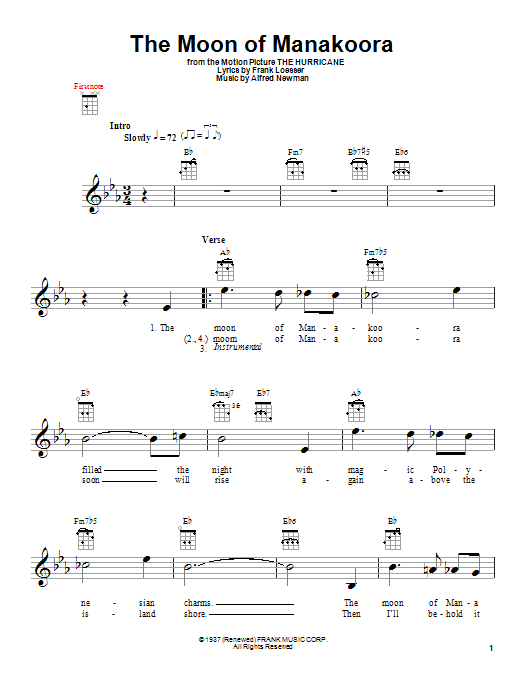 Download or print Alfred Newman The Moon Of Manakoora sheet music, chords and digital score arranged for Piano, Vocal & Guitar Chords (Right-Hand Melody). This Folk score includes 2 page(s).