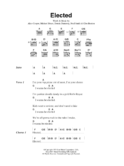 Download or print Alice Cooper Elected sheet music, chords and digital score arranged for Guitar Chords/Lyrics. This Rock score includes 3 page(s).