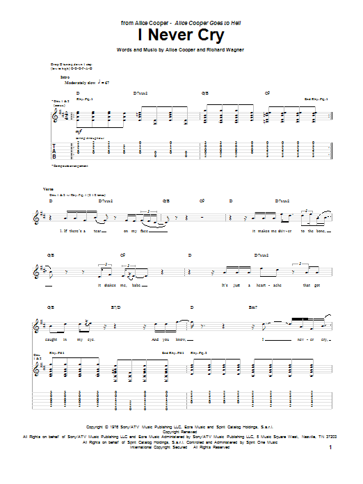 Download or print Alice Cooper I Never Cry sheet music, chords and digital score arranged for Guitar Tab. This Pop score includes 8 page(s).