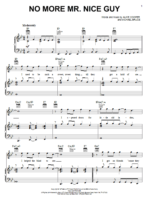 Download or print Alice Cooper No More Mr. Nice Guy sheet music, chords and digital score arranged for Piano, Vocal & Guitar Chords (Right-Hand Melody). This Metal score includes 4 page(s).