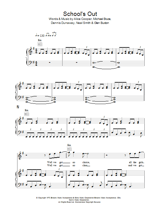 Download or print Alice Cooper School's Out sheet music, chords and digital score arranged for Guitar Chords/Lyrics. This Rock score includes 2 page(s).