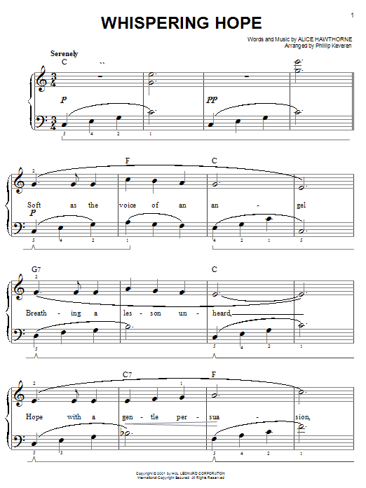 Download or print Alice Hawthorne Whispering Hope (arr. Phillip Keveren) sheet music, chords and digital score arranged for Easy Piano. This Folk score includes 4 page(s).