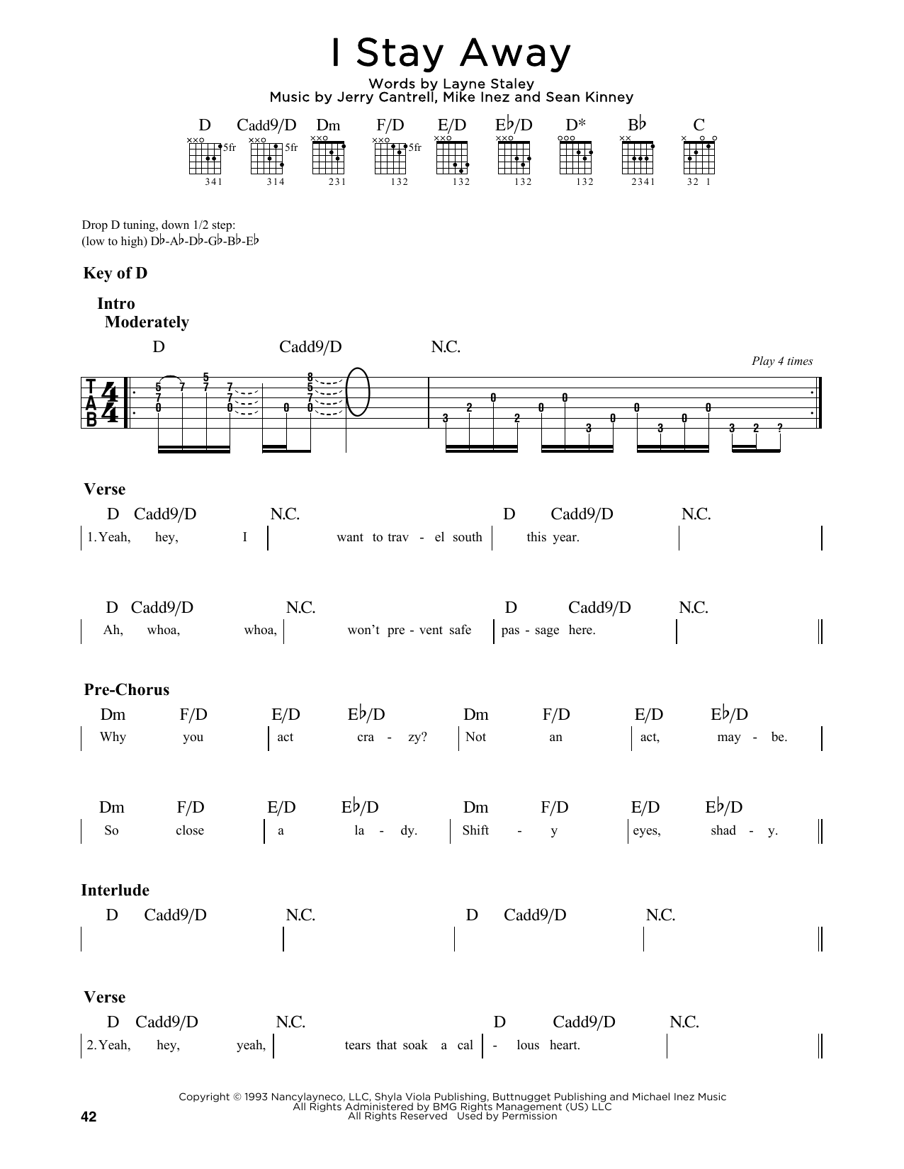 Download or print Alice In Chains I Stay Away sheet music, chords and digital score arranged for Guitar Tab. This Pop score includes 4 page(s).