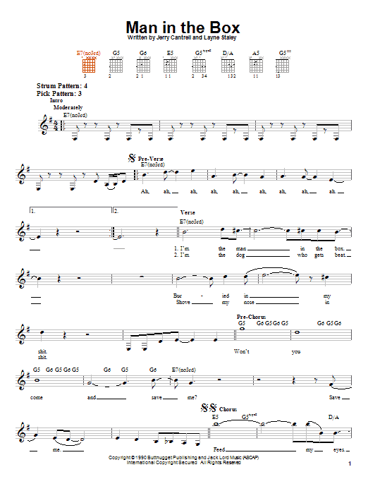 Download or print Alice In Chains Man In The Box sheet music, chords and digital score arranged for Guitar Tab. This Alternative score includes 8 page(s).
