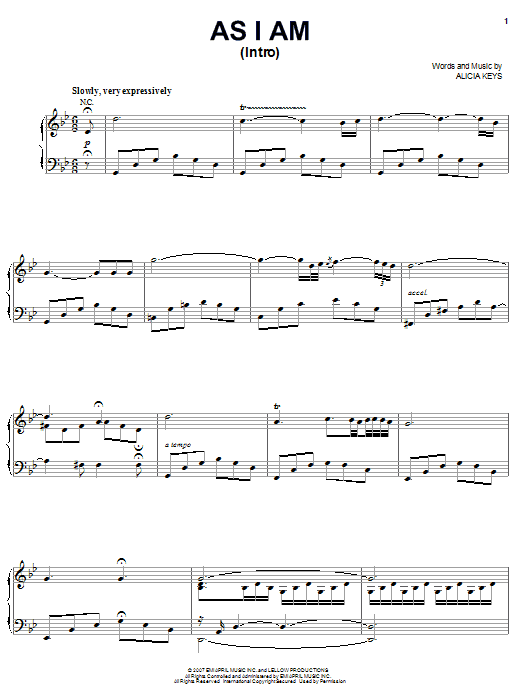 Download or print Alicia Keys As I Am (Intro) sheet music, chords and digital score arranged for Piano, Vocal & Guitar Chords (Right-Hand Melody). This Pop score includes 3 page(s).