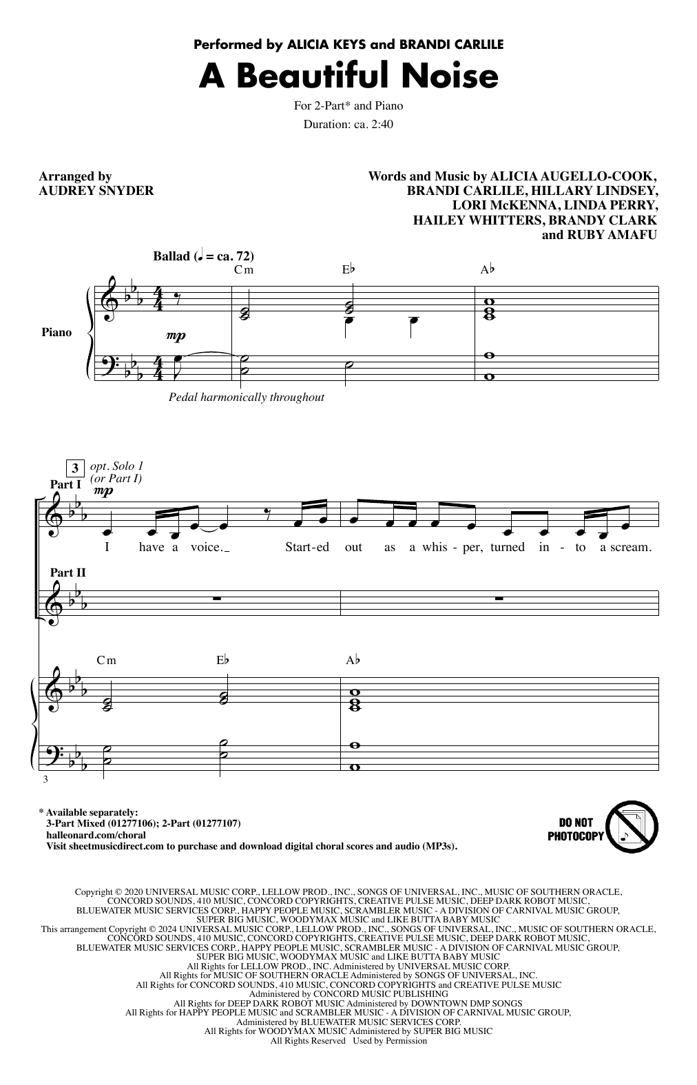 Download or print Alicia Keys & Brandi Carlile A Beautiful Noise (arr. Audrey Snyder) sheet music, chords and digital score arranged for 3-Part Mixed Choir. This Pop score includes 11 page(s).