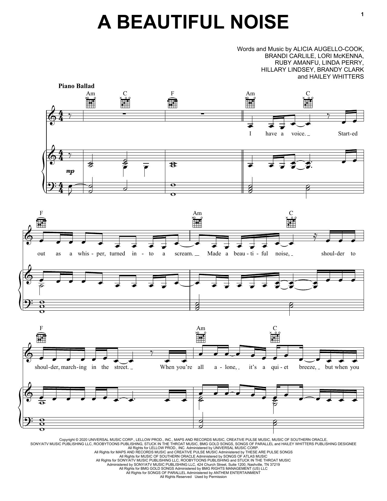 Download or print Alicia Keys & Brandi Carlile A Beautiful Noise sheet music, chords and digital score arranged for Piano, Vocal & Guitar Chords (Right-Hand Melody). This Pop score includes 6 page(s).