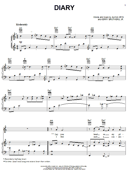 Download or print Alicia Keys Diary sheet music, chords and digital score arranged for Piano, Vocal & Guitar Chords (Right-Hand Melody). This Pop score includes 7 page(s).