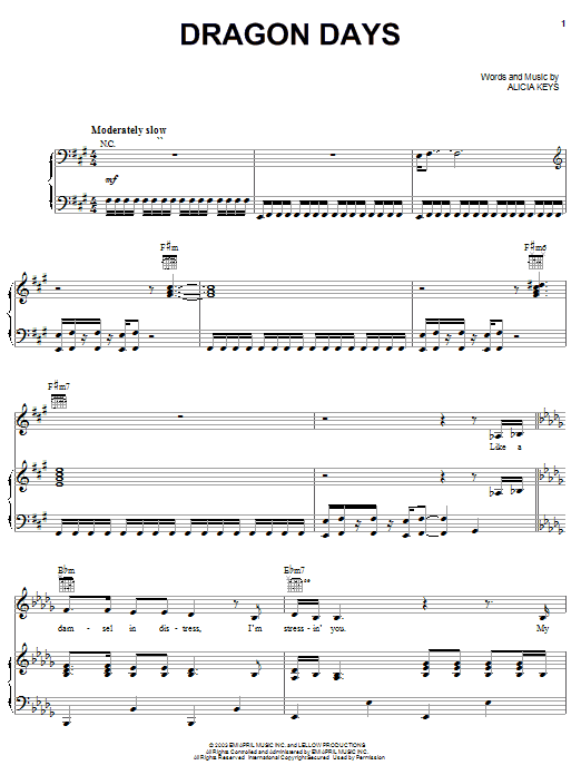 Download or print Alicia Keys Dragon Days sheet music, chords and digital score arranged for Piano, Vocal & Guitar Chords (Right-Hand Melody). This Pop score includes 8 page(s).