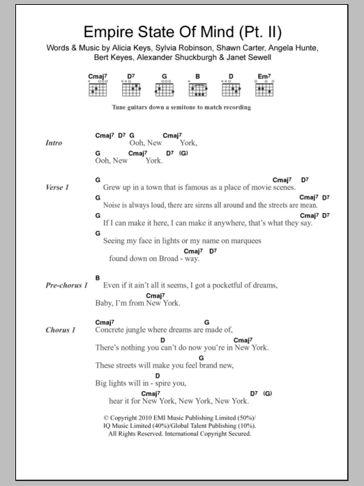 Download or print Alicia Keys Empire State Of Mind (Part II) Broken Down sheet music, chords and digital score arranged for Guitar Chords/Lyrics. This R & B score includes 2 page(s).