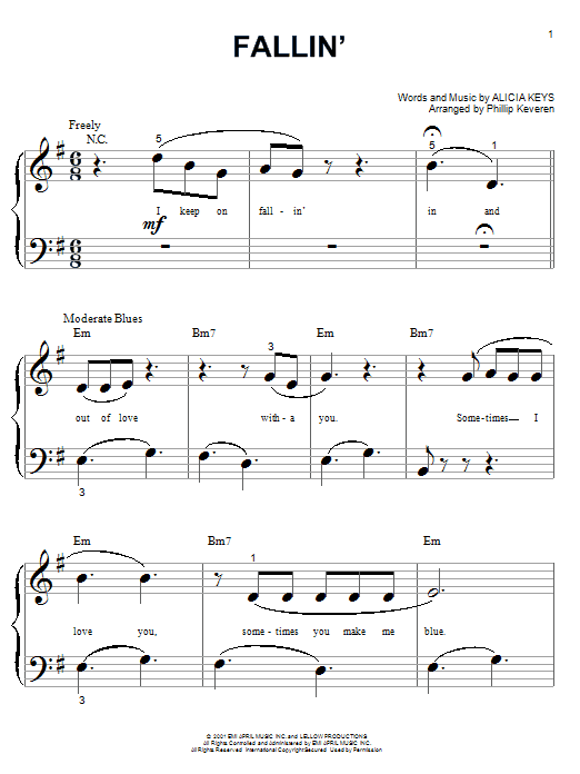 Download or print Alicia Keys Fallin' (arr. Phillip Keveren) sheet music, chords and digital score arranged for Big Note Piano. This Love score includes 5 page(s).