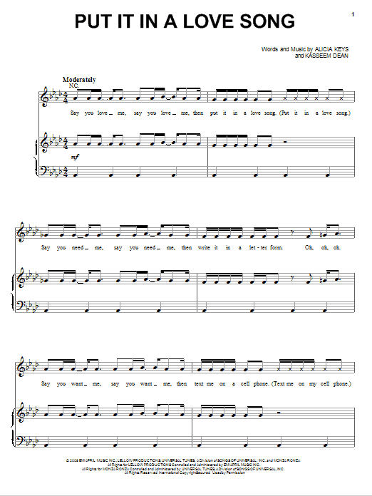 Download or print Alicia Keys Put It In A Love Song sheet music, chords and digital score arranged for Piano, Vocal & Guitar Chords (Right-Hand Melody). This Pop score includes 6 page(s).