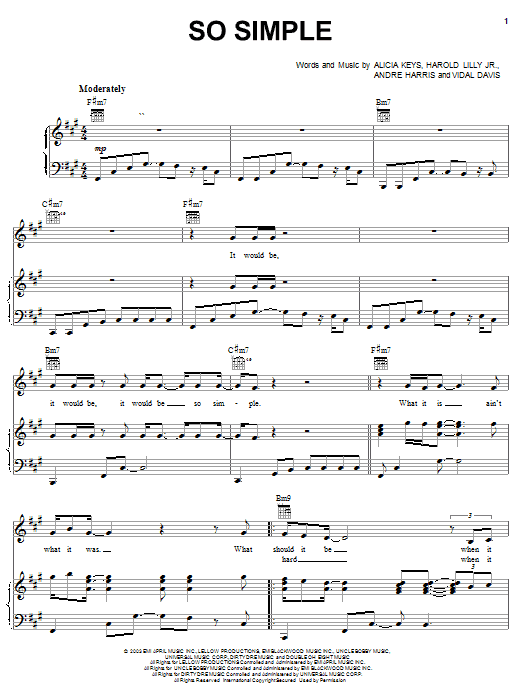 Download or print Alicia Keys So Simple sheet music, chords and digital score arranged for Piano, Vocal & Guitar Chords (Right-Hand Melody). This Pop score includes 9 page(s).
