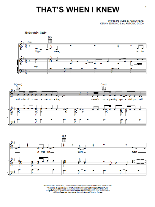 Download or print Alicia Keys That's When I Knew sheet music, chords and digital score arranged for Piano, Vocal & Guitar Chords (Right-Hand Melody). This Pop score includes 9 page(s).
