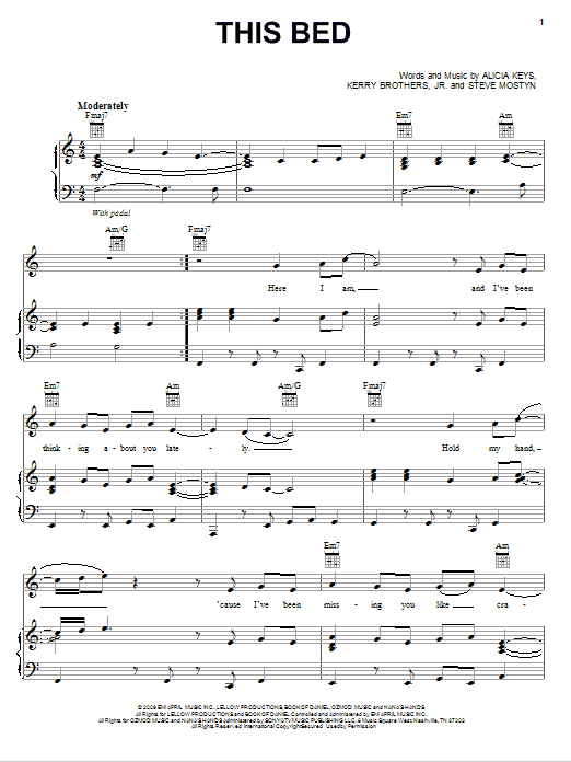 Download or print Alicia Keys This Bed sheet music, chords and digital score arranged for Piano, Vocal & Guitar Chords (Right-Hand Melody). This Pop score includes 7 page(s).