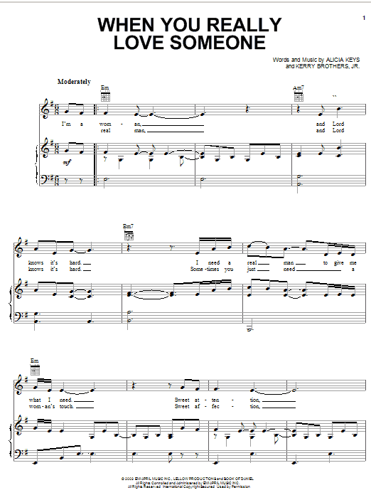 Download or print Alicia Keys When You Really Love Someone sheet music, chords and digital score arranged for Piano, Vocal & Guitar Chords (Right-Hand Melody). This Pop score includes 7 page(s).