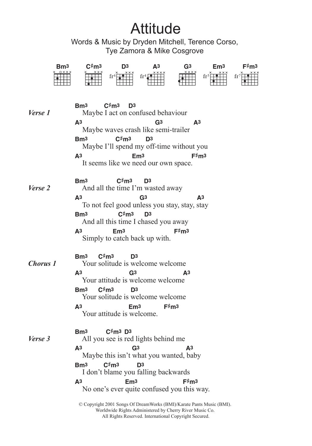 Download or print Alien Ant Farm Attitude sheet music, chords and digital score arranged for Guitar Chords/Lyrics. This Rock score includes 2 page(s).