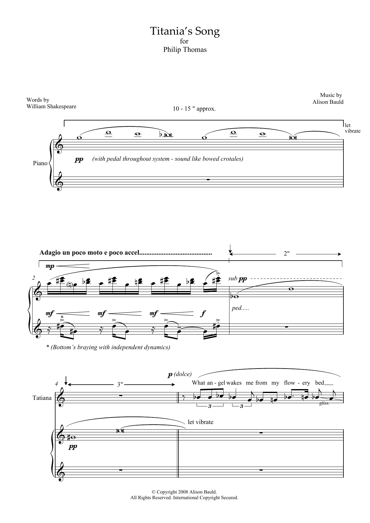 Download or print Alison Bauld Titania's Song (for soprano and piano) sheet music, chords and digital score arranged for Piano & Vocal. This Classical score includes 7 page(s).