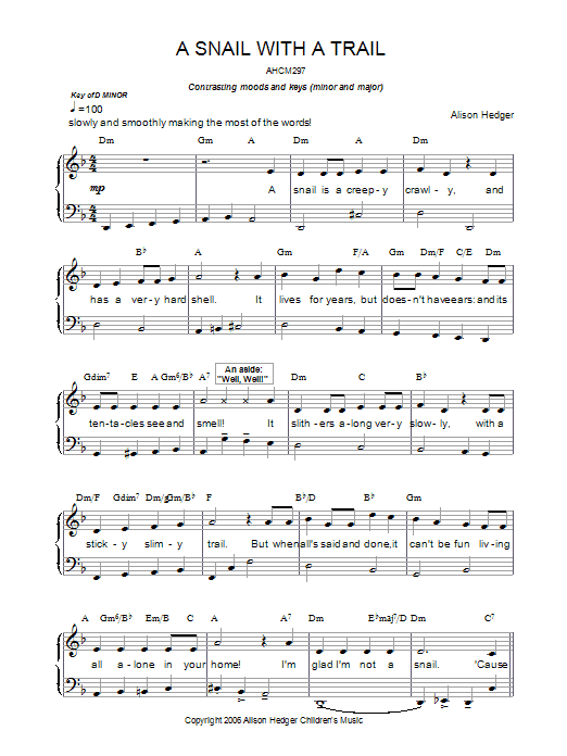 Download or print Alison Hedger A Snail With A Trail sheet music, chords and digital score arranged for Piano, Vocal & Guitar Chords. This Children score includes 2 page(s).