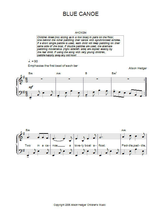 Download or print Alison Hedger Blue Canoe sheet music, chords and digital score arranged for Piano, Vocal & Guitar Chords. This Children score includes 2 page(s).
