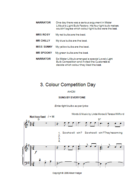 Download or print Alison Hedger Colour Competition Day (from Mister Lillibub's Lovely Light Bulbs) sheet music, chords and digital score arranged for Piano, Vocal & Guitar Chords. This Children score includes 3 page(s).