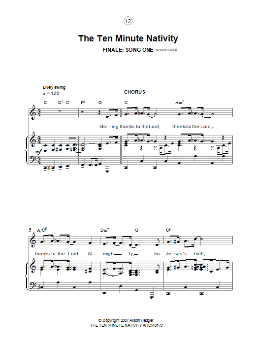Download or print Alison Hedger Finale (from The Ten Minute Nativity) sheet music, chords and digital score arranged for Piano, Vocal & Guitar Chords. This Children score includes 4 page(s).