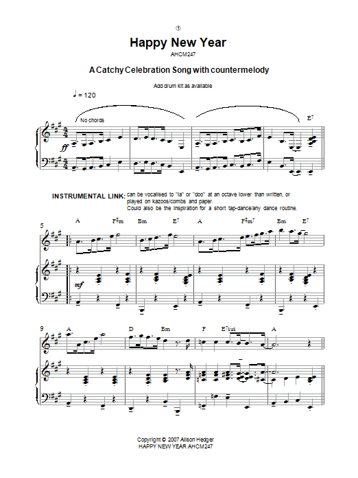 Download or print Alison Hedger Happy New Year sheet music, chords and digital score arranged for Piano, Vocal & Guitar Chords. This Children score includes 6 page(s).