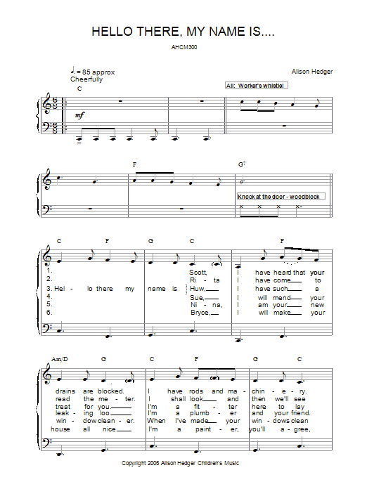 Download or print Alison Hedger Hello There, My Name Is . . . sheet music, chords and digital score arranged for Piano, Vocal & Guitar Chords. This Children score includes 2 page(s).