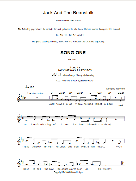 Download or print Alison Hedger Song 1 (from Jack And The Beanstalk) sheet music, chords and digital score arranged for Lead Sheet / Fake Book. This Children score includes 5 page(s).