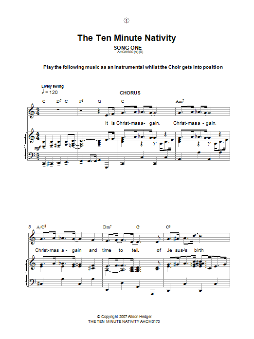Download or print Alison Hedger Song One / Instrumental Introduction (from The Ten Minute Nativity) sheet music, chords and digital score arranged for Piano, Vocal & Guitar Chords. This Children score includes 3 page(s).
