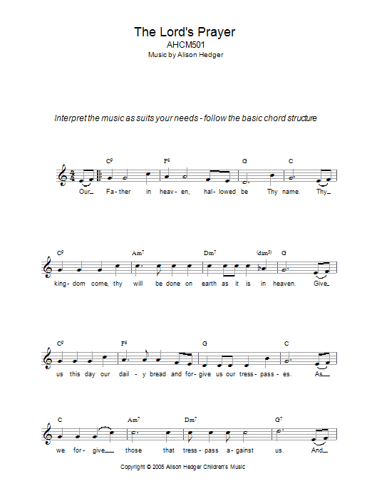 Download or print Alison Hedger The Lord's Prayer sheet music, chords and digital score arranged for Lead Sheet / Fake Book. This Children score includes 2 page(s).